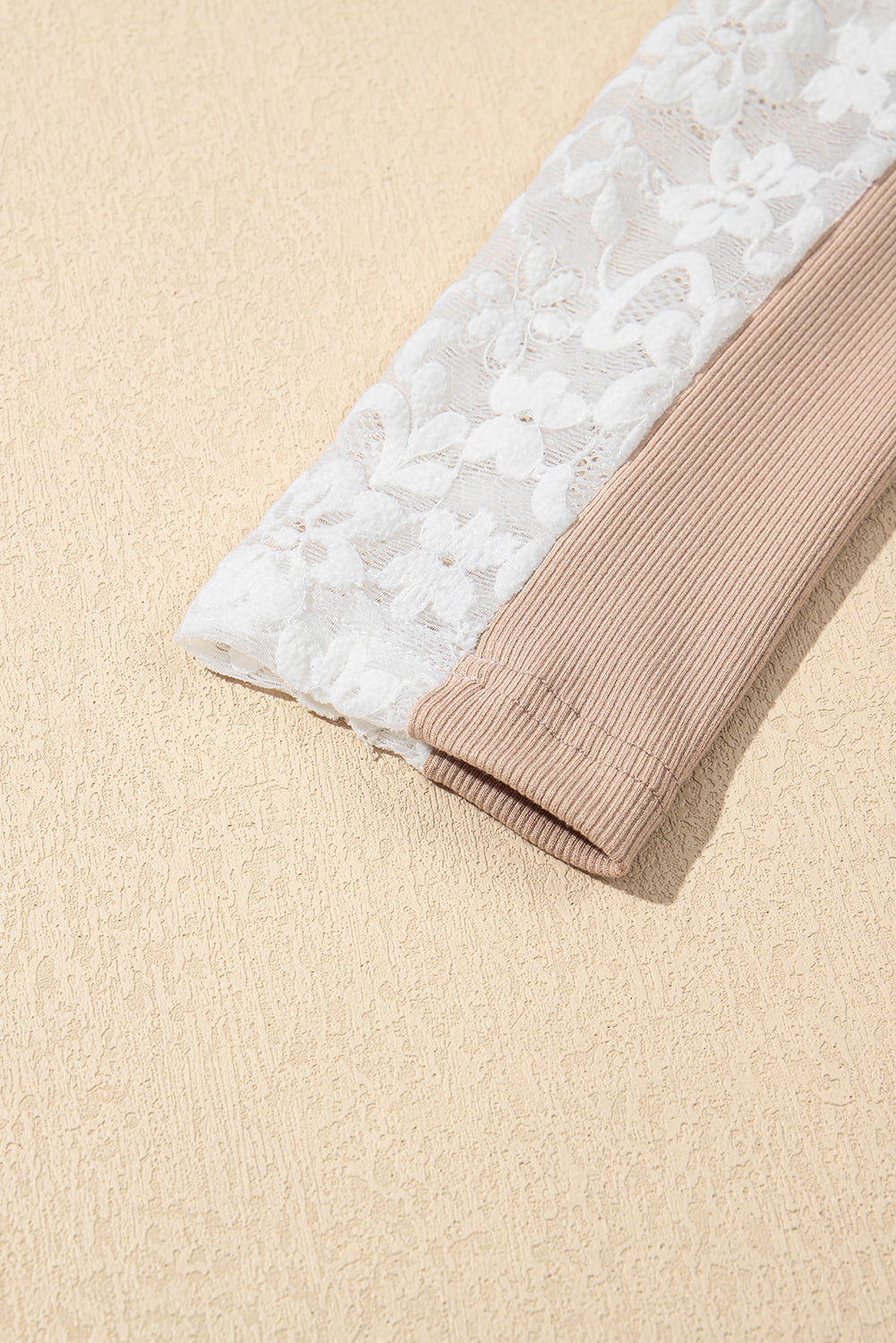 Smoke Gray Floral Lace Patchwork Long Sleeve High Neck Slim Top